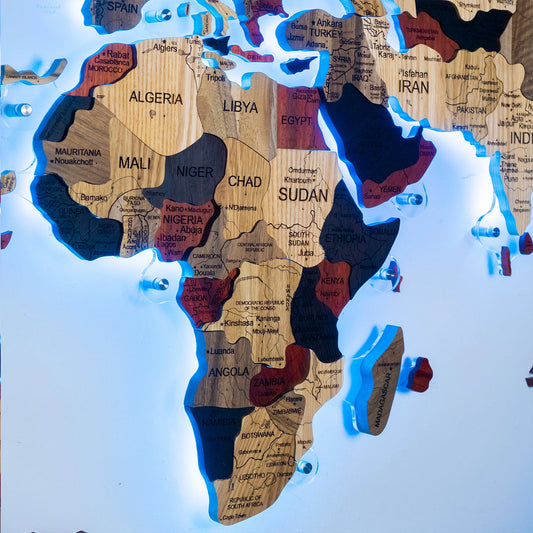 خريطة العالم ثلاثية الأبعاد مع إضاءة خلفية LED - خشب صلب
