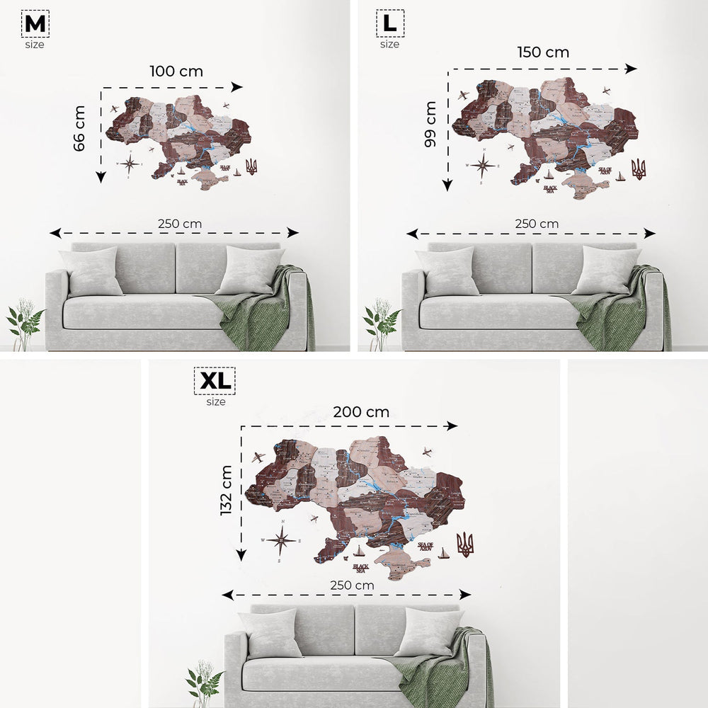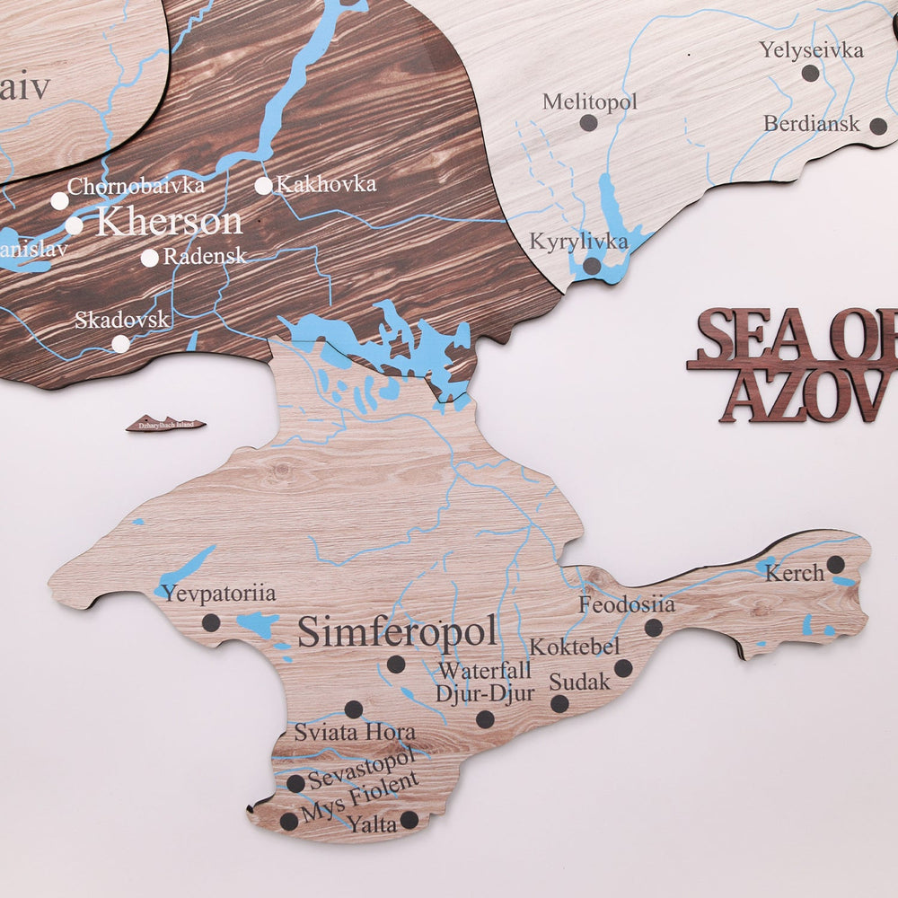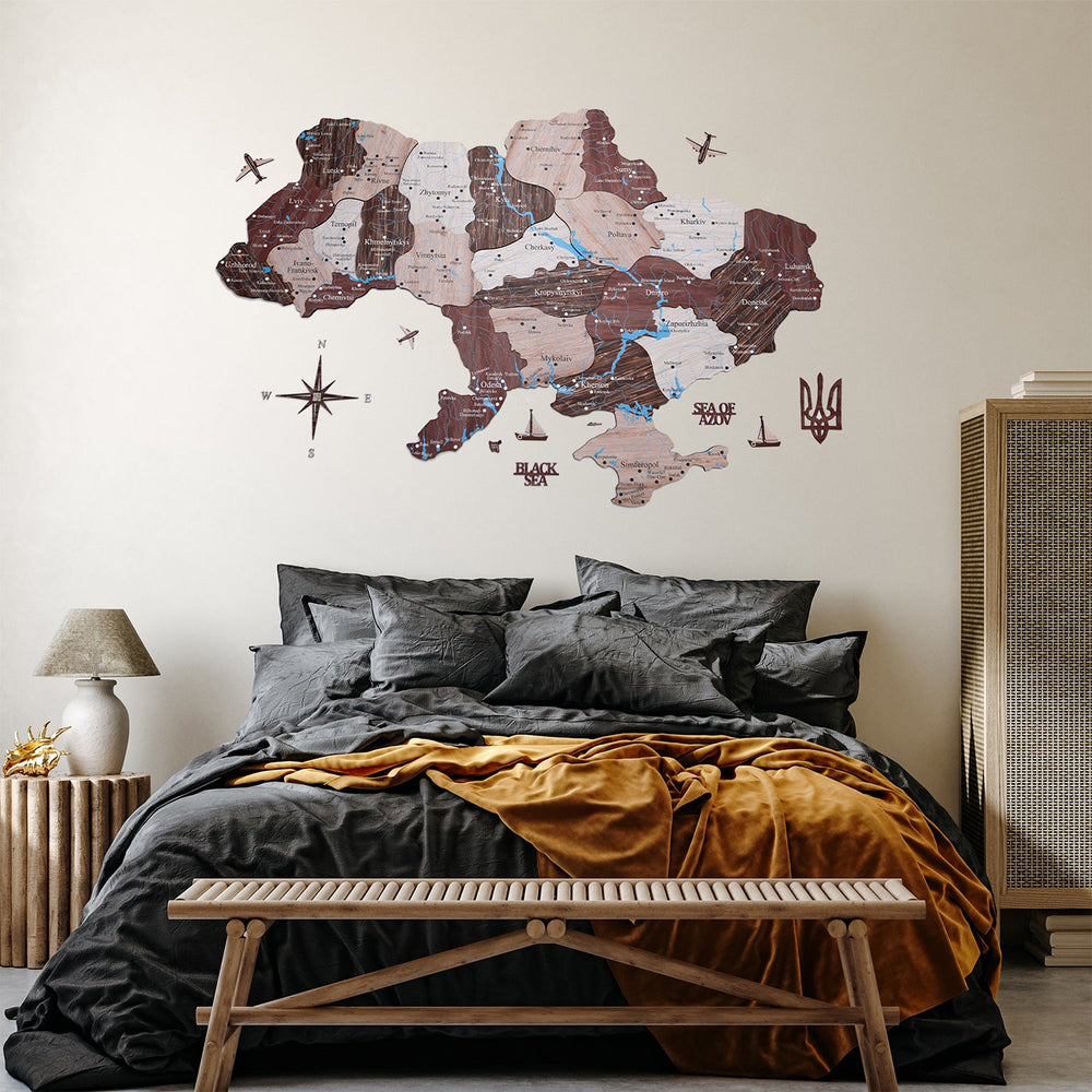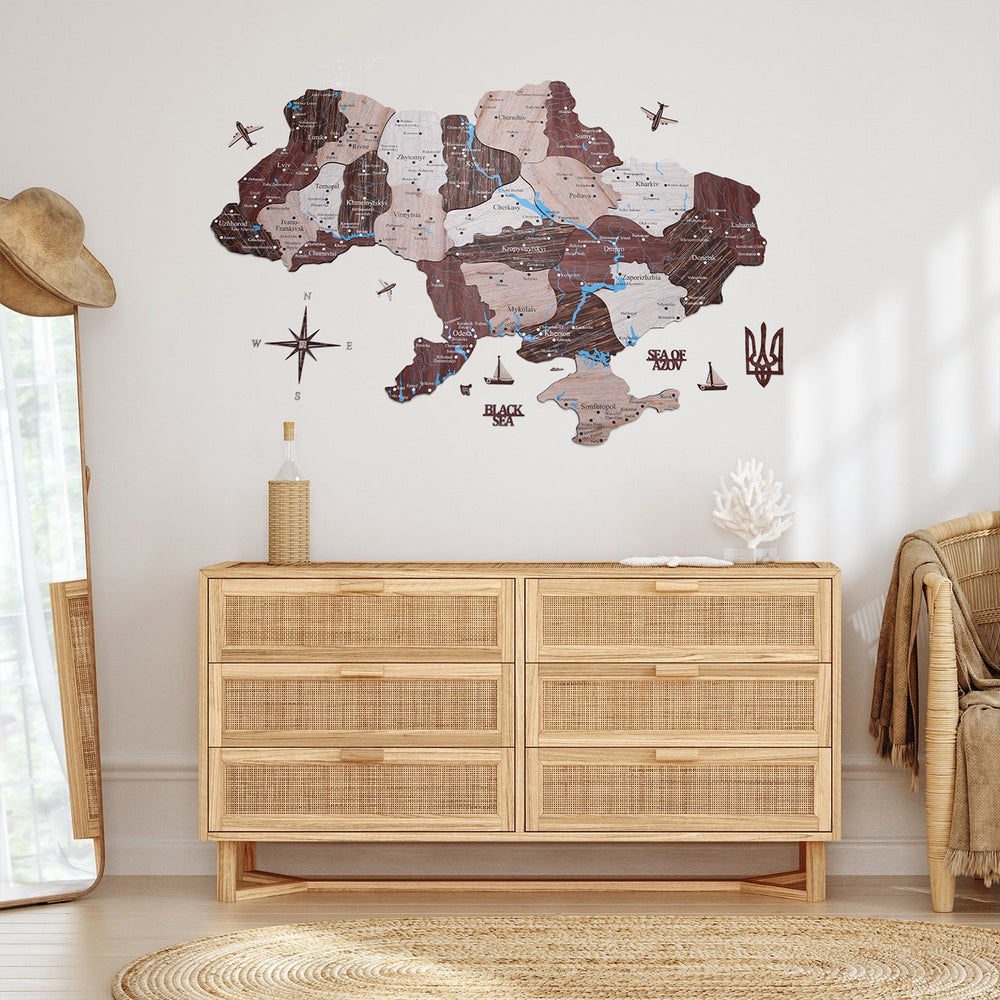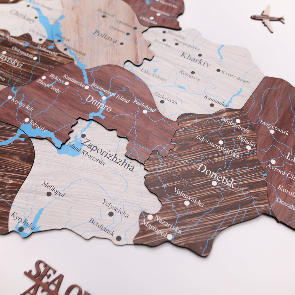 In addition to the map, the package includes wooden compass, planes, boats, sea names, and Coat of Arms of Ukraine. Detailed instructions are also provided to help you assemble and mount the map on your wall with ease.