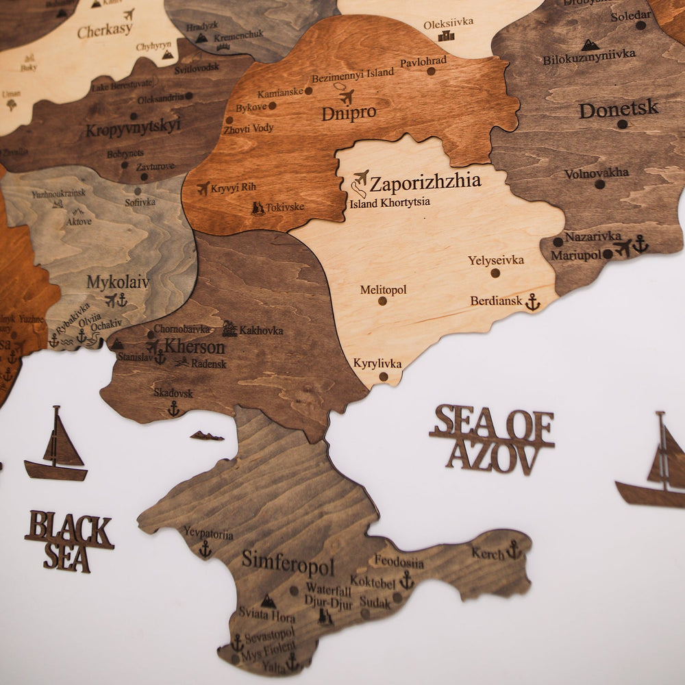 The package includes a wooden compass, planes, boats, sea names, and Coat of Arms of Ukraine. Detailed instructions on how to put it on the wall are also provided. Plus, the special double-sided tape used is strong enough to hold the Map pieces on the wall without damaging wallpaper.
