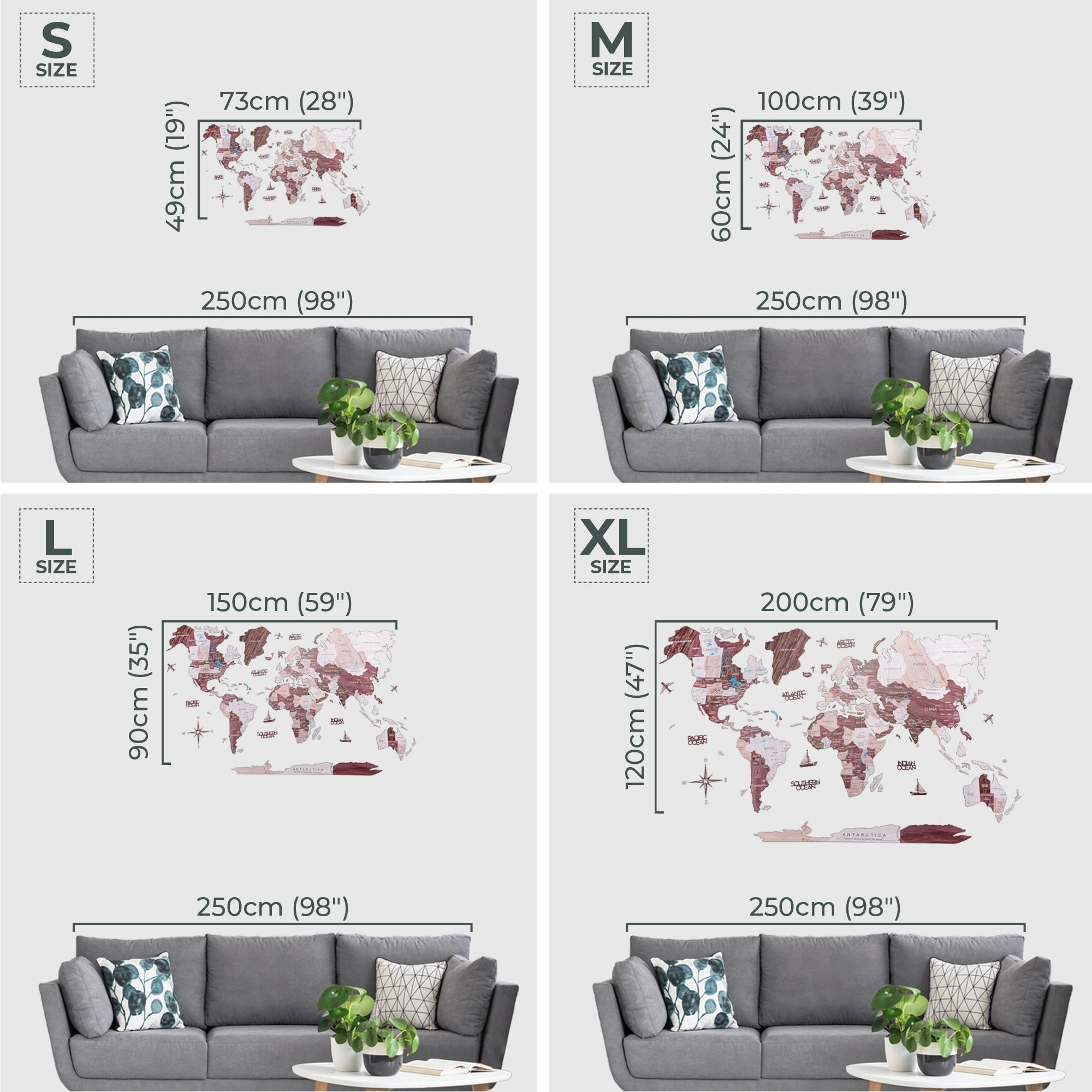 [الوصف] تأتي خريطة العالم الخشبية ثنائية الأبعاد بأربعة أحجام: