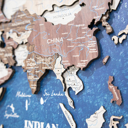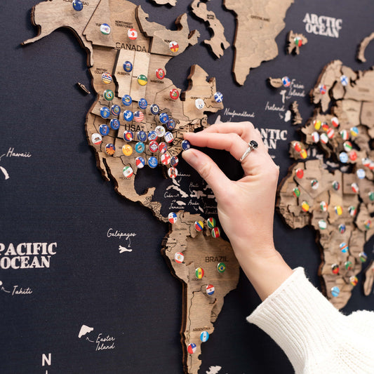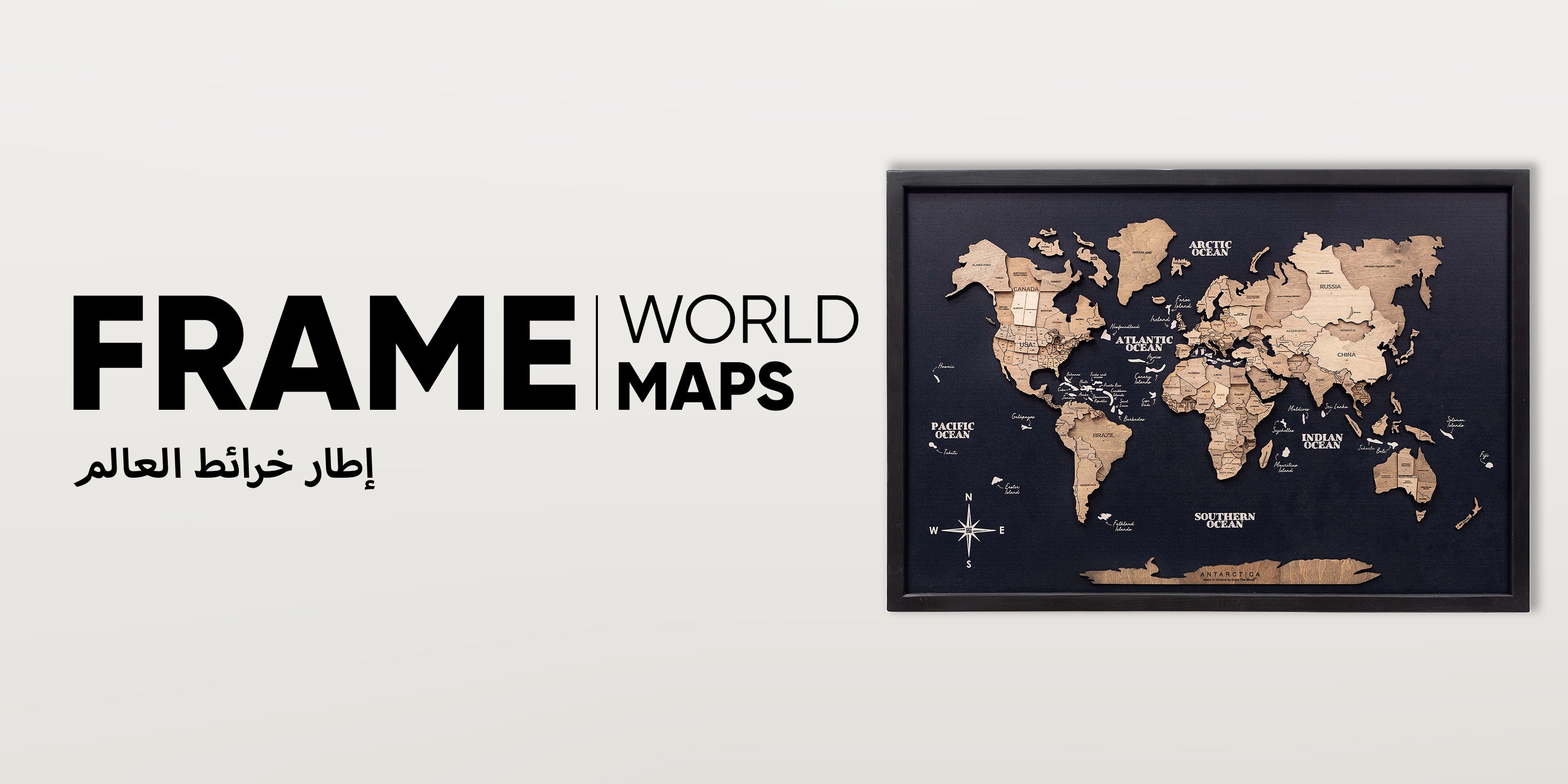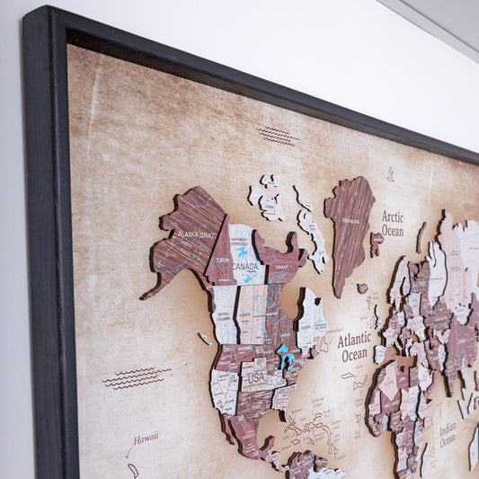 Choose from a variety of frame colors (white or black) and backgrounds (white, black, or ocean-themed) to suit your space. The wooden maps themselves come in a stunning range of finishes including Multicolor, Terra, Dark Walnut, Cappuccino, and more.