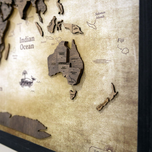 3D Wooden World Map on Panel - Dark Walnut Vintage