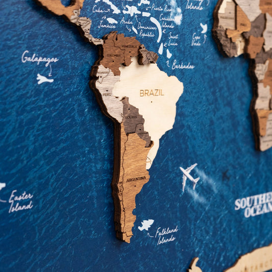 3D Wooden World Map on Panel - Cappuccino Ocean