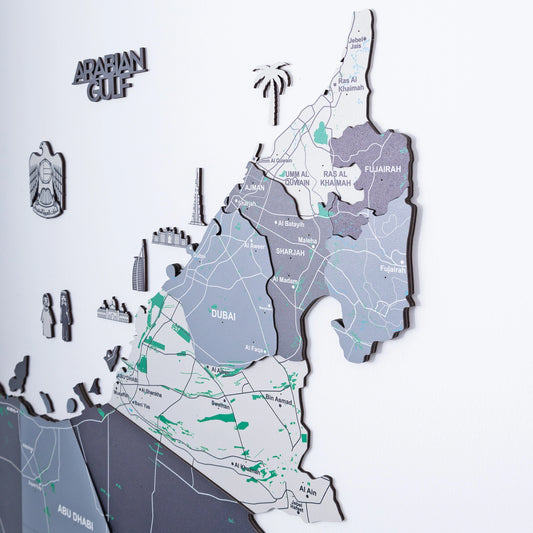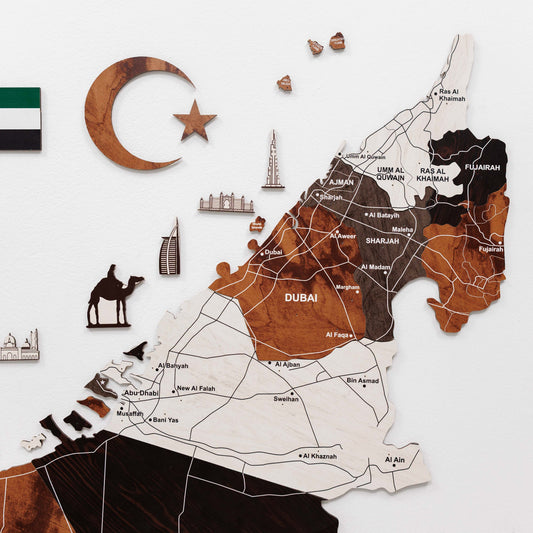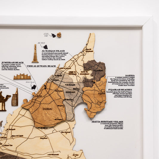 Celebrate the spirit of the United Arab Emirates with our handcrafted 3D Wooden UAE Map—a tribute to the nation’s rich heritage, modern skyline, and limitless ambition. Whether you're a proud resident, a business owner, or a UAE enthusiast, this map is a perfect statement piece for homes, offices, and commercial spaces.