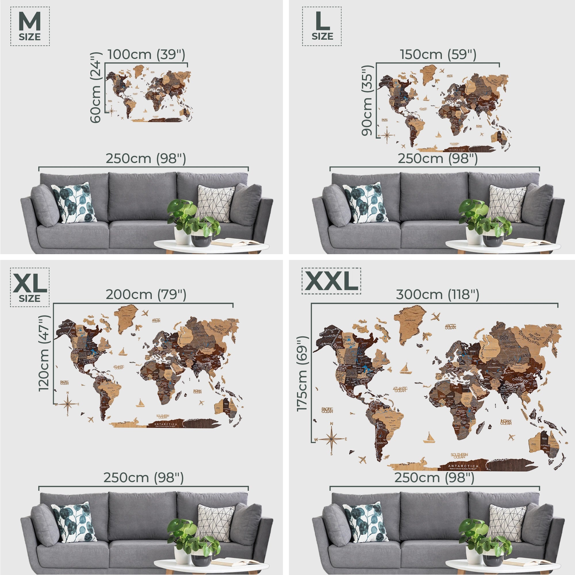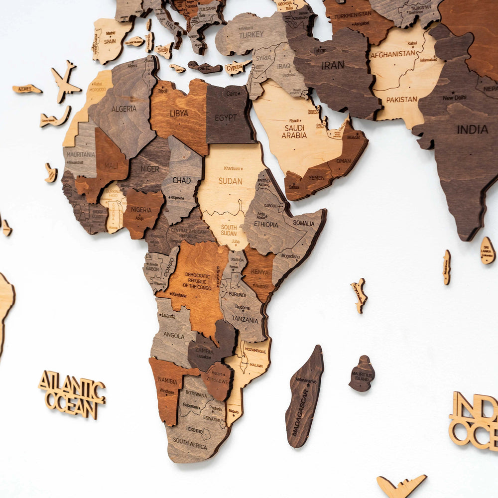 Expertly handcrafted from eco-friendly birch plywood, our multi-layer 3D Wooden World Maps add depth, character, and elegance to any wall. Designed for lasting beauty, they maintain their vibrancy for years. The default language is English, but you can customize names, colors, and sizes to fit your style.