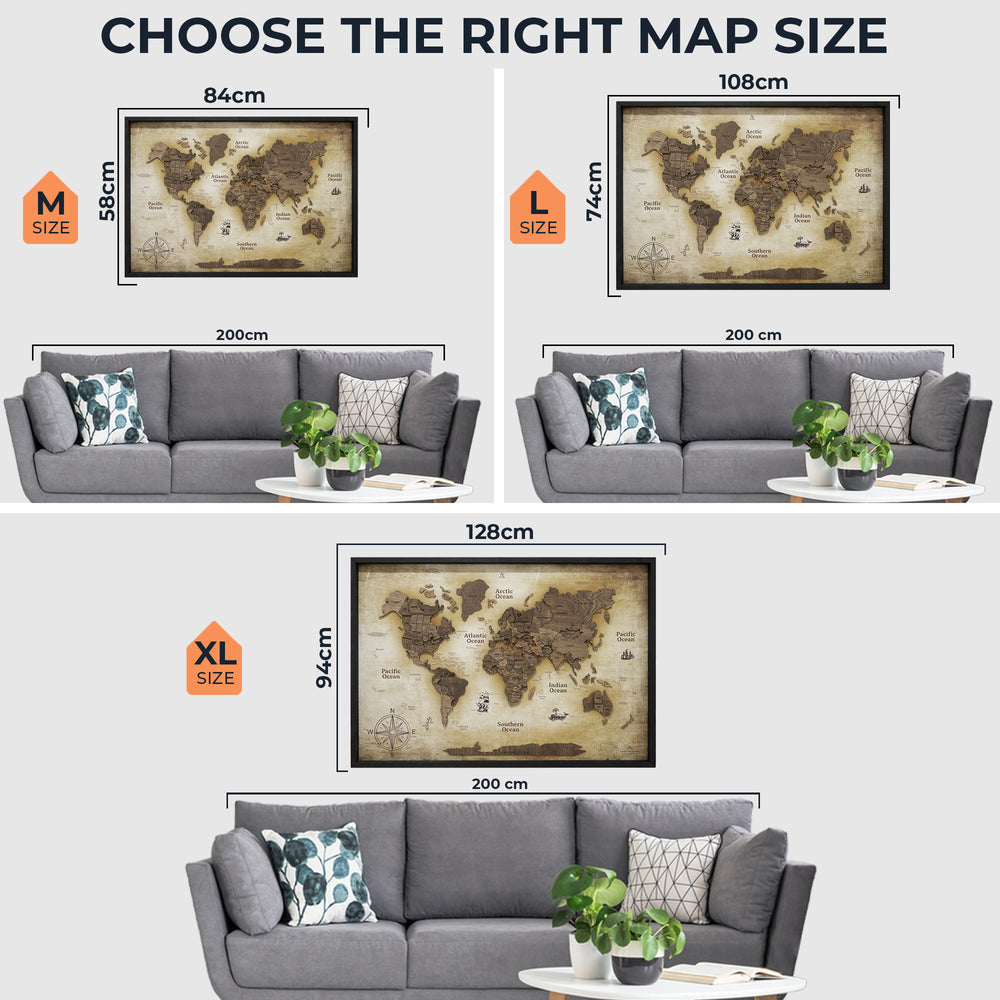 Enhance your map with Flag Push Pins 🏳️ to mark the countries you've visited, adding a personal touch to your decor. This panel map is not only a stunning decoration but also an excellent conversation starter and an opportunity to personalize the color palette of your room.
